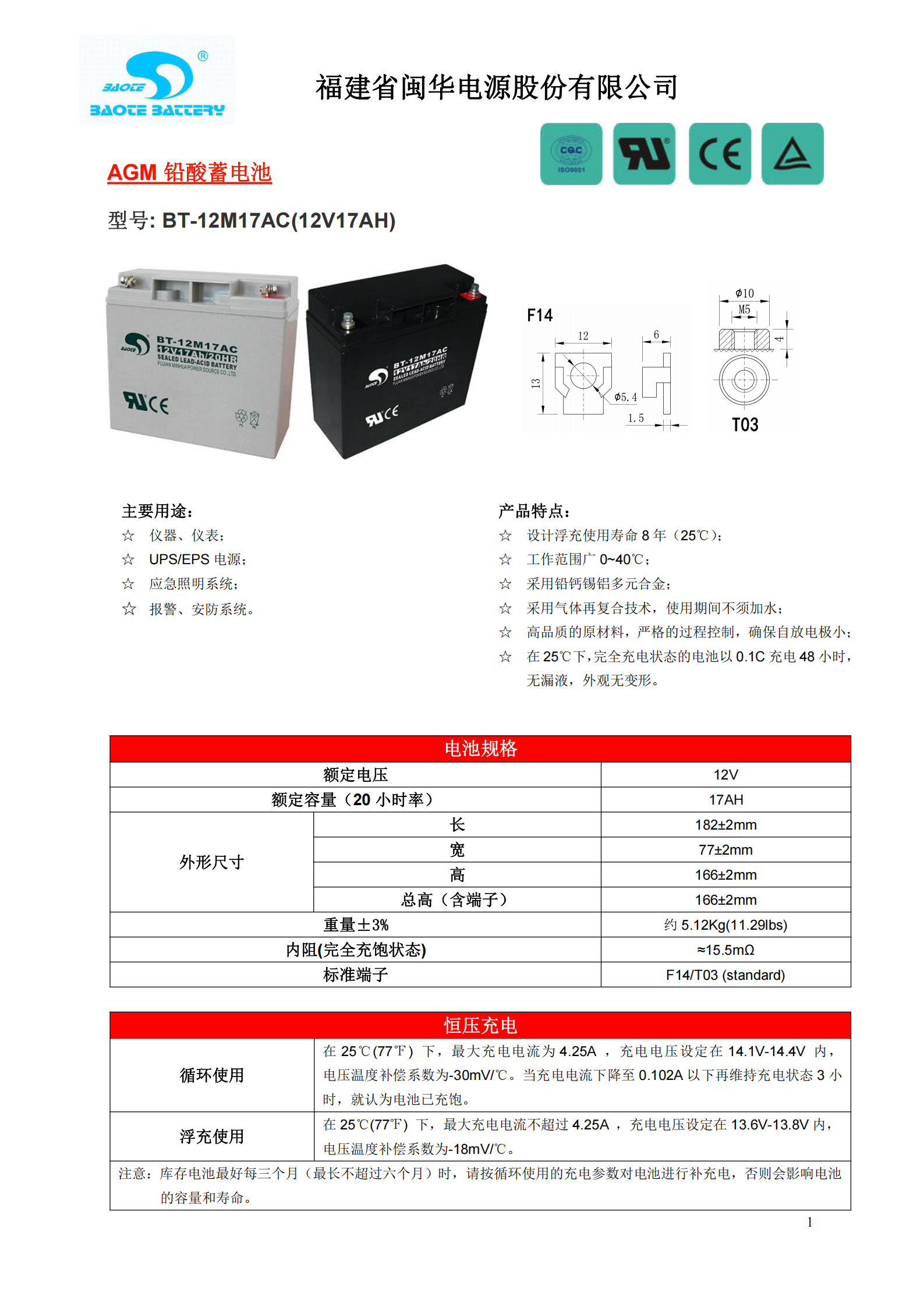 摘要:赛特蓄电池BT-12M17AC是一款12V17AH的铅酸蓄电池产品。该电池采用先进的铅钙合金板栅设计,具有优良的放电性能和循环寿命。产品尺寸为181mm×76mm×167mm(长×宽×高),重量约5.12kg。电池采用AGM隔板技术,电解液吸附在玻璃纤维隔板中,实现免维护设计。额定电压12V
